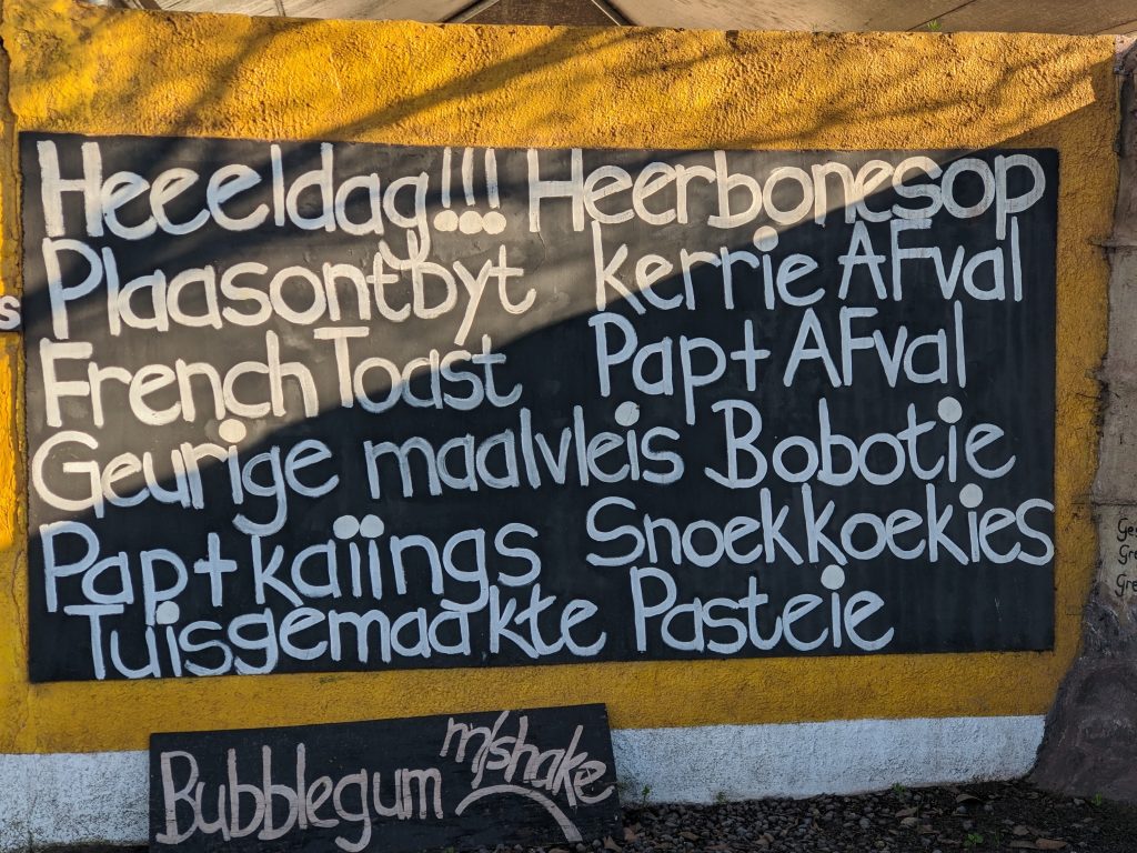 Kids in the village with their containers to get lunch.Lining up for lunch.Gianna and Allison with the ladies that make and serve lunch.Jared helping to clean chairs and pews to put in the church building.The bean porridge served to the kids is tasty and nourishing.Gianna and Jessica preparing awnings to put up on the church building.Putting up the awning proved to be much more complicated than they anticipated. Extra support was needed inside first.The church building with the finished awnings.Jessica and Allison crocheted and knitted hats and scarves for the children in the village.Children playing in the road in the village.We went to breakfast with our South African friends at a Homestyle farmhouse for some authentic local food. It was winter there and the weather was cold, so standing by the wood stove felt wonderful!Sign outside the restaurant highlighting some of the meals available here (written in Afrikaans)One of the many beautiful beaches, featuring a special type of sandstone in the Saldanha area. That’s Jessica standing on top of the rock.Gianna, Jared, Jessica and our local friend Karen looking for shells on the beach.Eating lunch at a beautiful restaurant by the sea.This was a breakfast porridge one morning at our hotel.An eclectic gift shop in Paternoster village featured some lovely sitting areas.Drawing in the sand under a majestic sky.Fun on the beach!The village of Paternoster is characterized by these white houses.Shark bay is a very large shallow bay, where when the tide is low, a very large sandbar is exposed in the middle.Sheep and flamingos spotted while driving down the road.We saw many old boats used as gardens.Shark Bay.Zebras grazing near the roadside.