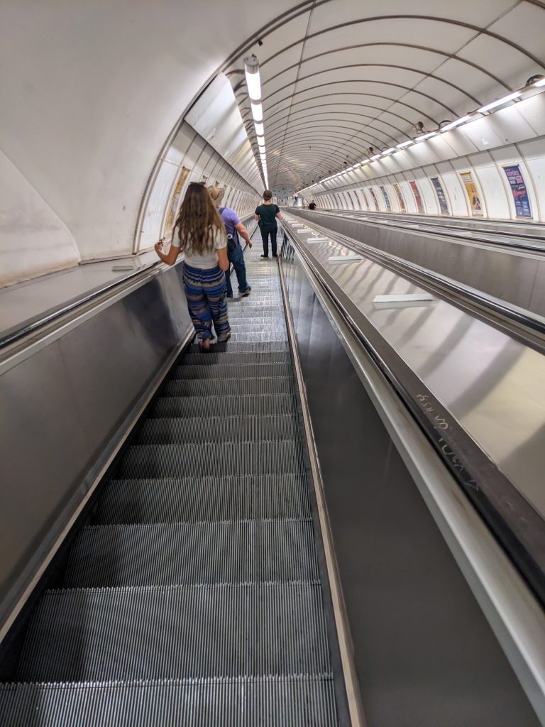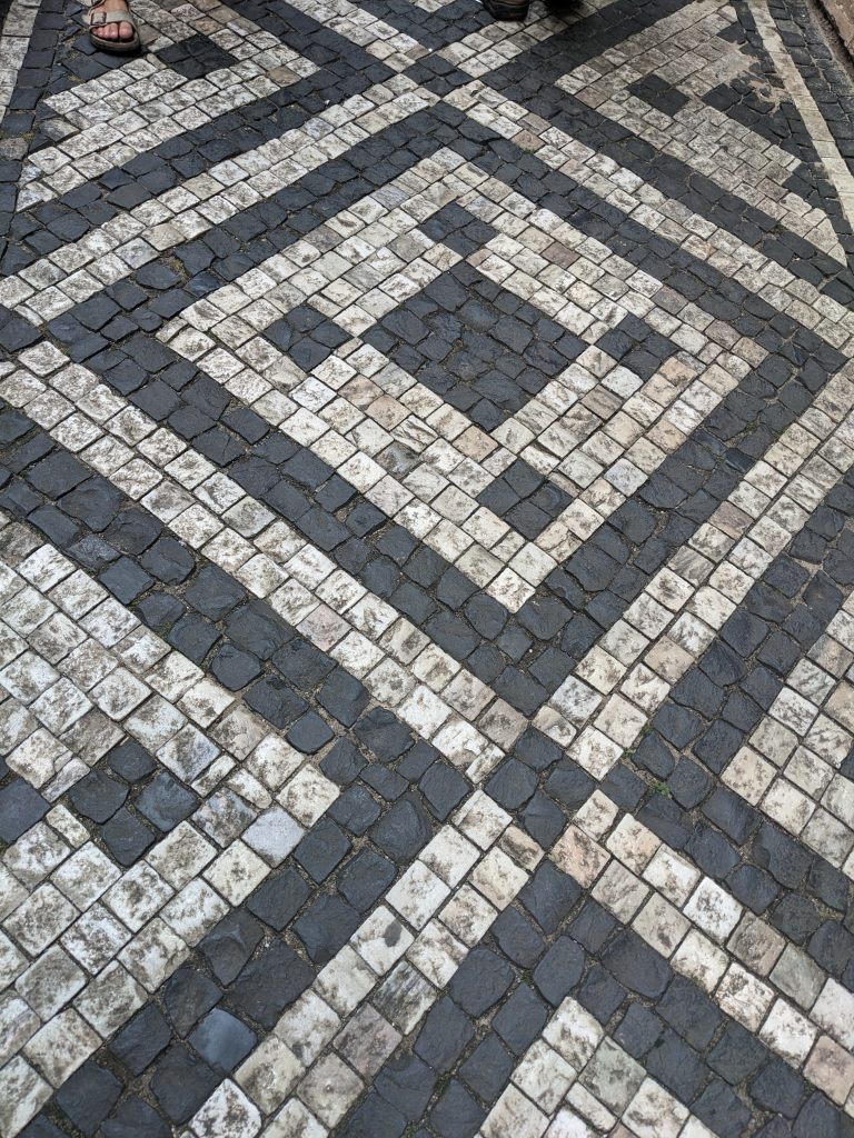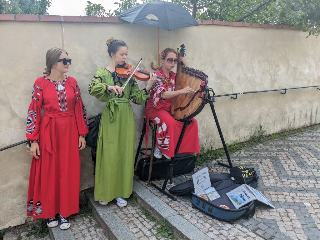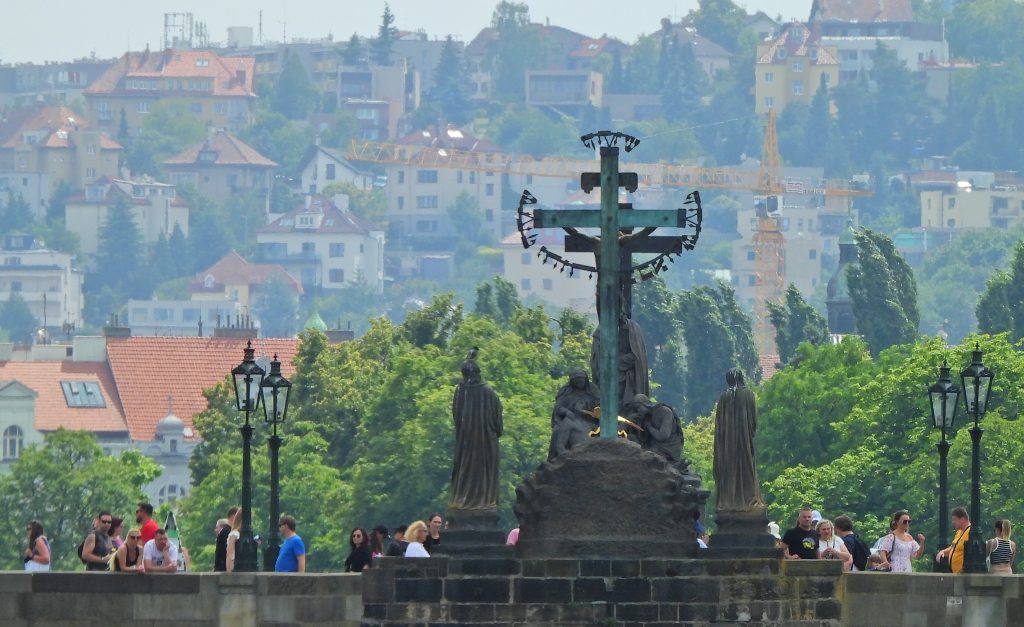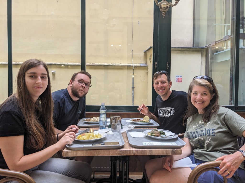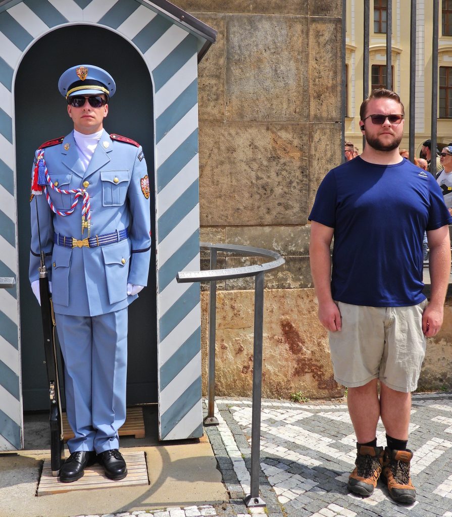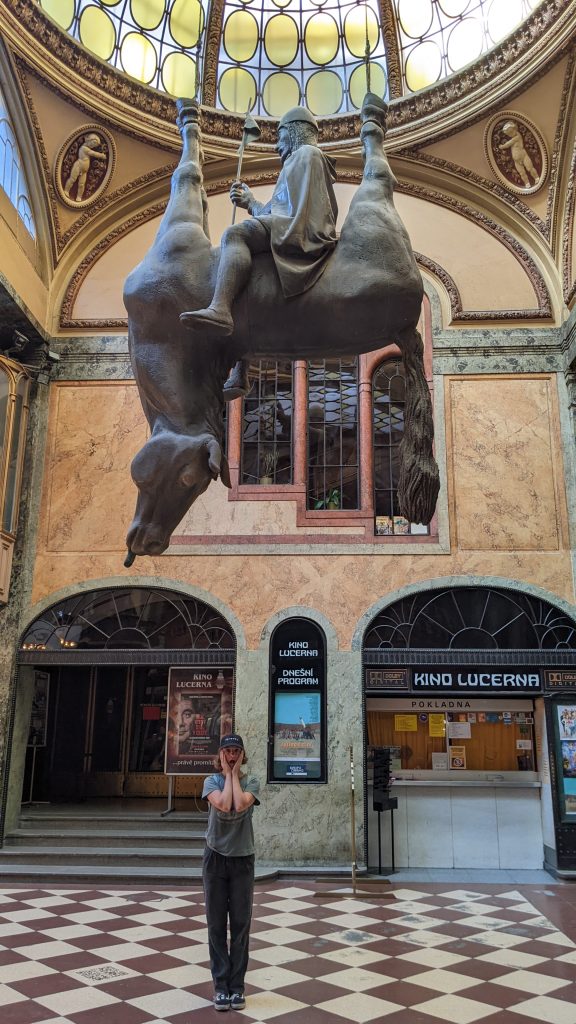 Prague is known as the “City of a Hundred Spires”. The 13th century Saint Vitus Cathedral is pictured here.We walked many miles while our friend guided our city tour. Eric carrying his backpack, Jessica her journal, Gianna her camera, and Jared taking a rest.St. Charles Bridge is a pedestrian bridge known by its many statues lining both sides.Cross on the bridgeHouses in the city were traditionally recognized by the unique symbols above their doorway, used kind of like an address. This is a particularly interesting one.The Dancing House, aka Fred and GingerThe above 3 pictures are of the St. Vitus Cathedral. The one on the right is the two-story pipe organ, where we listened to a concert on Jessica’s birthday.Singing groups as well as individual musicians are a common sight around the city. These ladies, on the Prague Castle grounds, are appropriately dressed for the ancient castle, as they play medieval style music.The Astronomical Clock, from the 15th century, still functions and people gather regularly to watch the hourly walk of the Apostle figures which come out of the two small windows at the top. The astronomical dial shows the position of the sun and the moon in the sky.Jared and our local friends having a traditional lunch of dumplings and meat.These are Trdelnik, a pastry made from ropes of dough wrapped around a rod and often coated in cinnamon sugar. The rods rotate like a rotisserie, slowly baking the doughy treat over coals or some other heat source.Jared posing with a guard at Prague Castle. The changing of the guard takes place every day at noon, with a formal ceremony, including a brass ensemble.These quirky statues are just two examples of the works of David Černý, found throughout the city. The statue in the photo on the left is of King Wenceslas riding upside down on a horse. “The Man Hanging Out” on the right is of Sigmund Freud. Interesting designs can even be found when you look down. These are examples of some sidewalk patterns formed by cobblestones.Golden Lane, thus named because of the goldsmiths that lived there, is part of the Prague Castle grounds. Small colorful houses line the street and house shops and relics from the castle, like this suit of armor.A fun and creative candy shop is designed like a mine, with trains and train cars filled with candy.Figure on St. Charles Bridge.Prague has one of Europe’s longest escalators, about 87 meters long. When you are at the top, you can’t even see the bottom!Jessica and Gianna on one of our many subway rides. Prague has an affordable, dependable, extensive transportation system that makes it easy to get around this vast city.