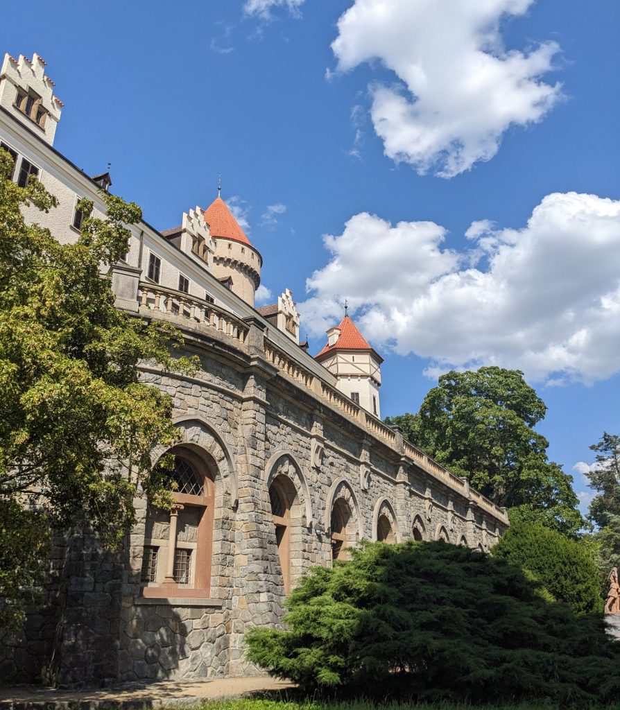 View from the castle’s patio.These colorful peacocks live on the castle grounds.The countryside on the way to the Konapiste Castle.