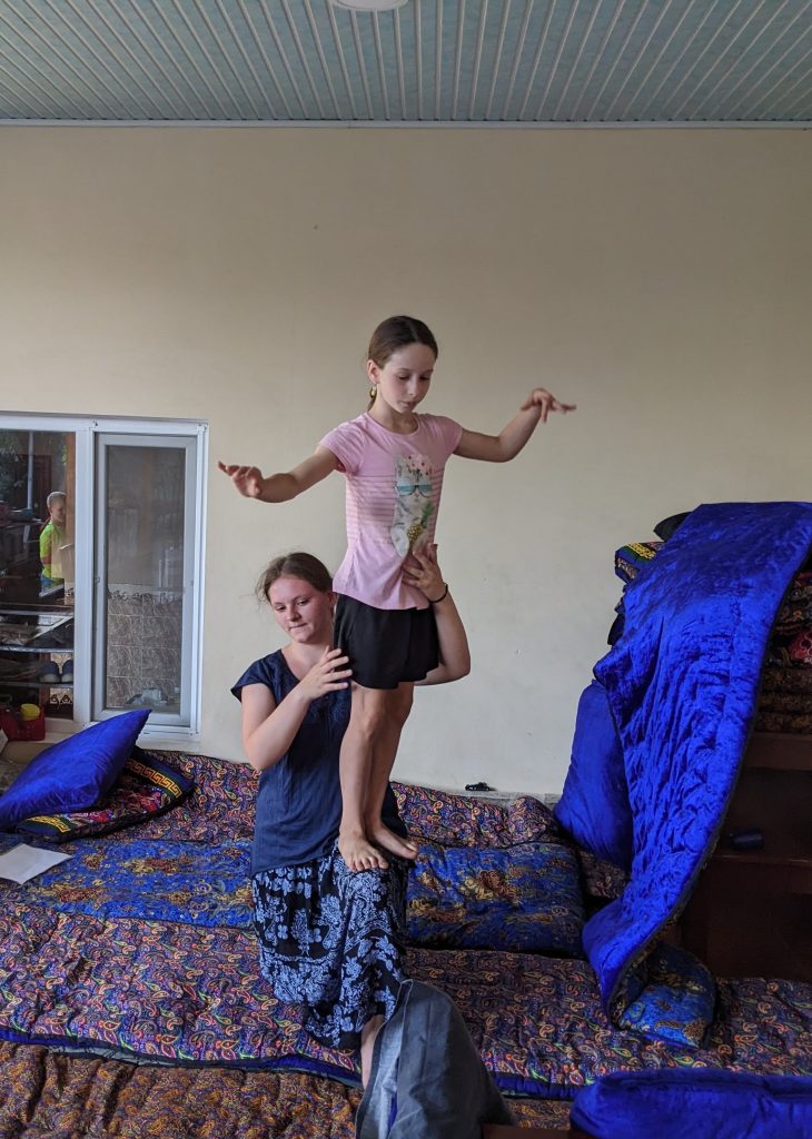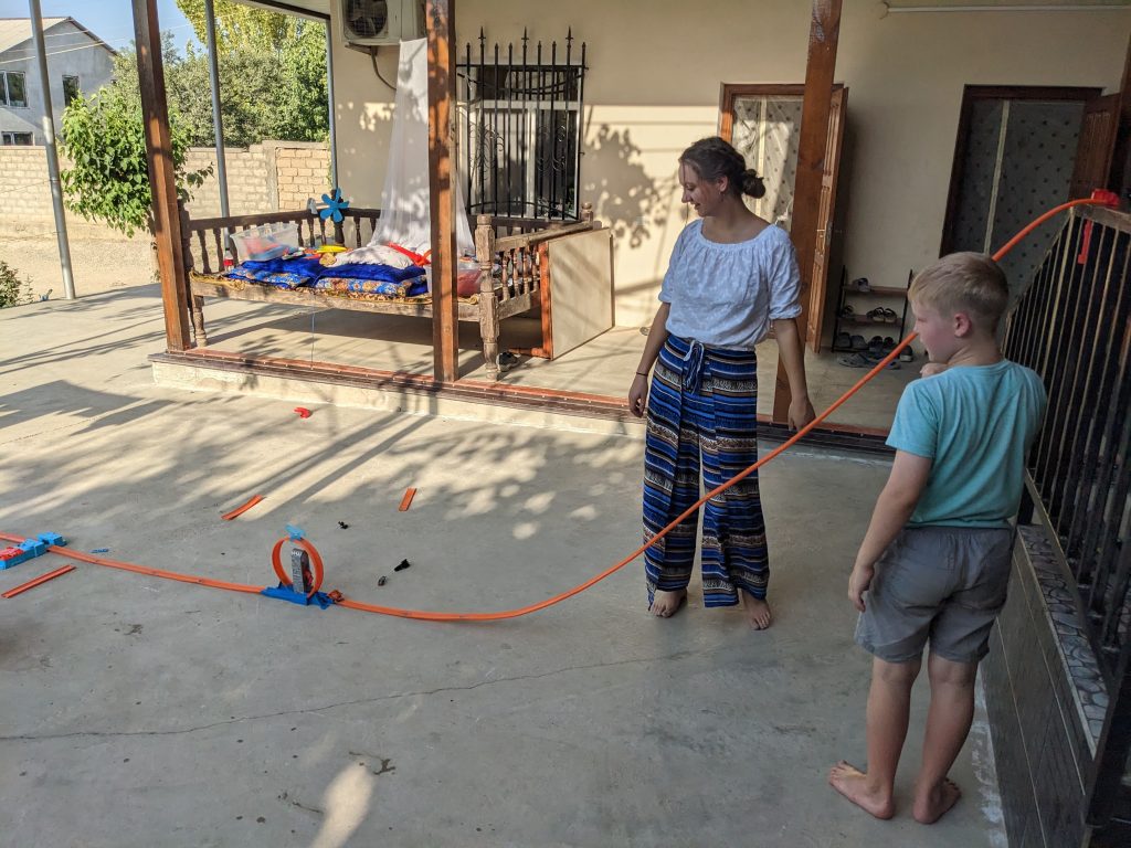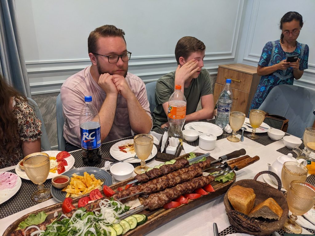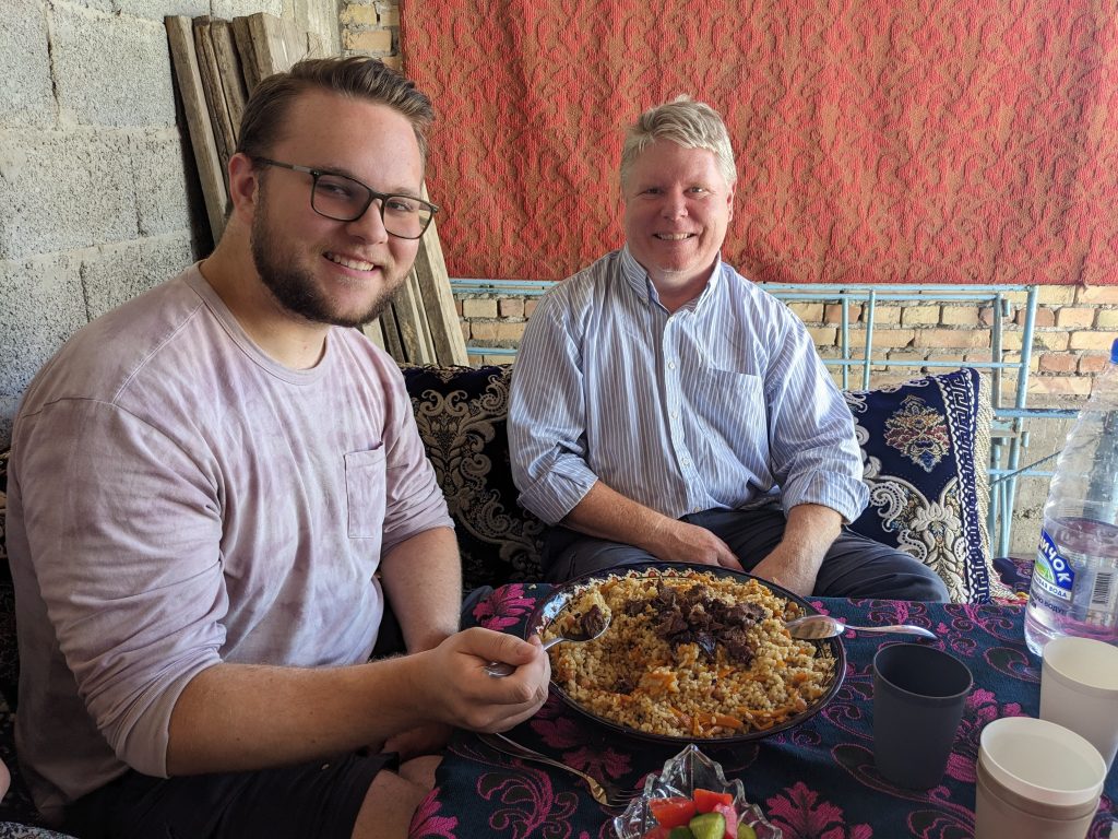 My mom, Jessica, Jared, and I spent most of our time here sharing in the English school classrooms. A lot of the people are trilingual or at least bilingual, usually being able to speak Tajik, Uzbek, and Russian. At the English school, we helped organize 600+ of their books according to the different reading levels. My dad worked in the IT office doing some training there. We also celebrated Jared’s birthday with the family we were staying with and more people that we met. We ate a lot of good food like osh, shashlik, sambusa, manti, qurutob, and a lot more. Jessica, my mom, and I also got to pick out some fabrics at the market and had some clothes custom made. Overall, it was so much fun, and we got to interact with so many different people.