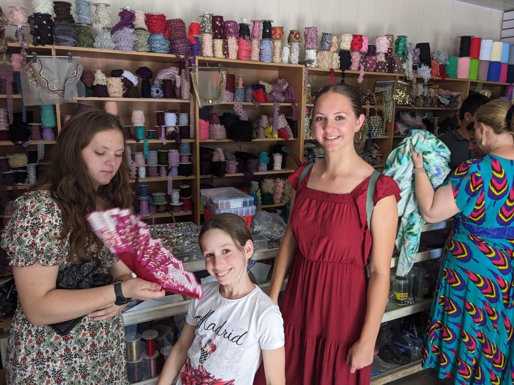 After choosing fabrics, we went to this embellishment store, where we picked out pretty strings of sequens and lace to add to our proposed outfits. Jessica and Gianna are pictured here with our friend Isabelle.