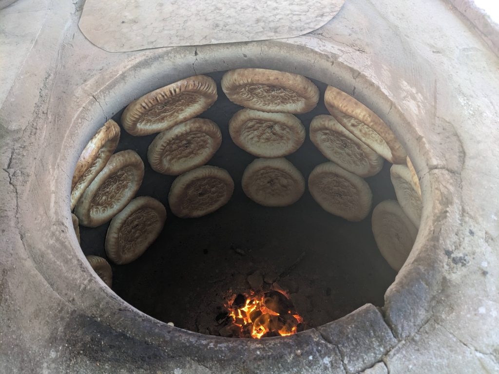 This local naan bread is cooking in a huge oven in town. This bread is baked fresh every morning. The bakers usually wear long gloves to place the round dough pieces on the sides of the oven, and then use a long-handled tool to remove the bread.